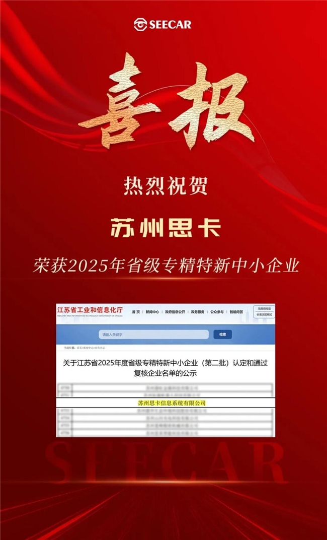 近日,江苏省工业和信息化厅正式公布2025年度省级专精特新中小企业名单,苏州市镇江商会理事单位苏州思卡信息系统有限公司(SEECAR)凭借在智能交通领域的卓越创新能力和行业影响力,成功入选这一重磅榜单。作为中国ITS路侧感知技术的领军企业,SEECAR再次以硬核实力印证了其在智慧交通赛道上的领跑地位。