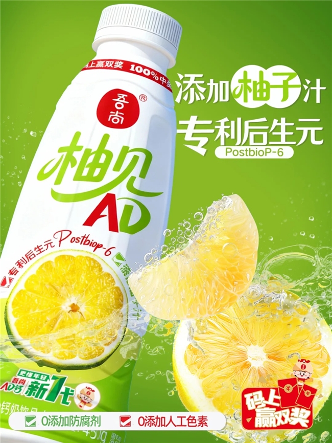 这款产品主打风味创新与情感共鸣。它在经典AD钙奶醇厚底味的基础上,注入清新自然的柚子香气,添加专利后生元PostbioP-6,0防腐剂,0人工色素,肠胃护航,解腻轻负担,实现了怀旧感与新奇感的精妙平衡。其目标直指既眷恋童年味道、又乐于拥抱变化的80、90后群体,以及追求新鲜口感的年轻消费者,加上“码上赢双奖,100%中奖”活动,堪称休闲与社交场景下的亮点饮品。