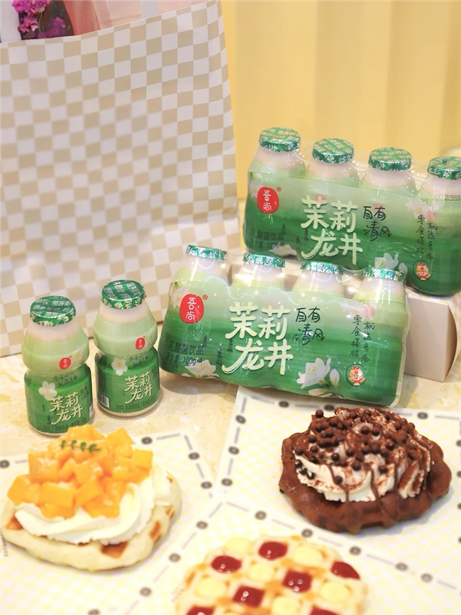 此款产品深挖地域文化特色,将标志性的甘冽龙井茶香,以及一抹清香茉莉,与活力酸甜的乳酸菌融合,一口入魂的清新滋味,0脂、0防腐剂、0人工色素的健康标准,成为各地消费者乃至海外市场青睐的“国潮”新品,饭后来一瓶解腻助消化,告别油腻负担,肠胃轻松无压力,下午茶搭甜品 口感更丰富,搭配蛋糕、马卡龙,清新中和甜腻,让每一口更高级,也叫响了”零食搭档就选吾尚“!